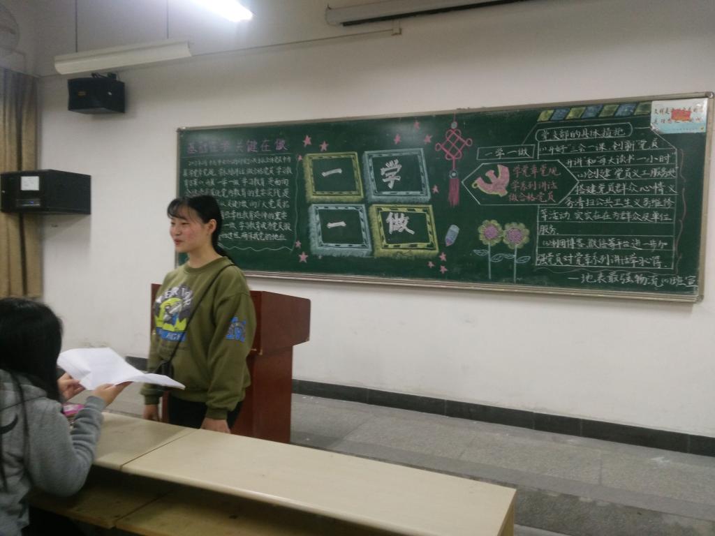 团会开始前,各班文艺委员组织同学们画好主题板报,做好PPT。团会开始前由主持人上台讲话,宣布团会开始。团会主要内容有观看视频、主持人讲解、讨论问答等。同学们都认真的观看视频,仔细的听着总书记讲话,在主持人富有感染力的讲解下学习党的知识。其中讨论回答环节,由主持人对“一学一做”相关内容做出提问,同学们都积极讨论,发表自己对“一学一做”的认识和观点,并派出代表做出回答。物流二班的团会还增加了奖励回答、组织同学们唱共青团团歌环节。