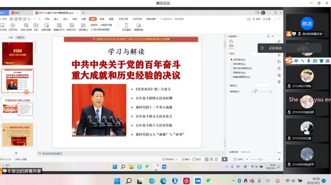 十九届六中全会明确指出理想信念和初心使命是百年来激励中国共产党人不懈奋斗的根本动力,为了进一步引导青年树立正确的价值观,物流学院于4月2日开展了以“学习十九届六中全会精神”为主题的线上团日活动。