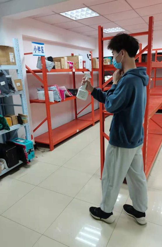 快递到达营业厅时,都会进行酒精消毒。快递营业厅值班的同学也会每天进行体温检查,全天佩戴口罩,并且早晚上下班时会进行酒精消杀。值班人员同时也进行了自我健康管理,定期定点核酸检测,上岗前使用消毒工具自我消毒,在保障快递派送安全的同时也知悉防疫要求,保障自身安全防控。