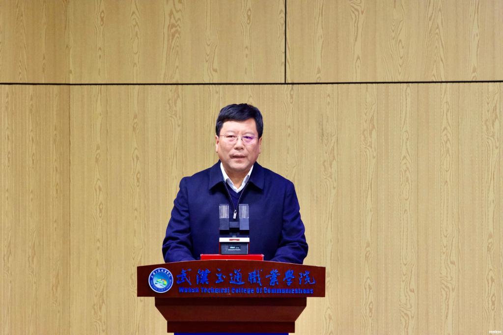 武汉理工大学交通物流学院党委书记肖耀根致辞。肖耀根表示,武汉理工大学是共同体的牵头单位之一,武汉理工大学交通物流学院是学校共同体建设的主要任务单位,将指导共同体内院校和企业人才学历层次提升,联合成员单位共建技术创新中心、产学研用协同创新平台,深入促进产教融合、职普融通,深化校企合作,为共同体的建设发展和良好运行做出积极贡献。