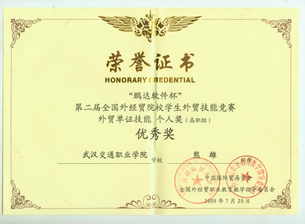 熊雄同学荣获2009年“鹏达软件杯”第二届全国外经贸院校学生技能竞赛个人优秀奖