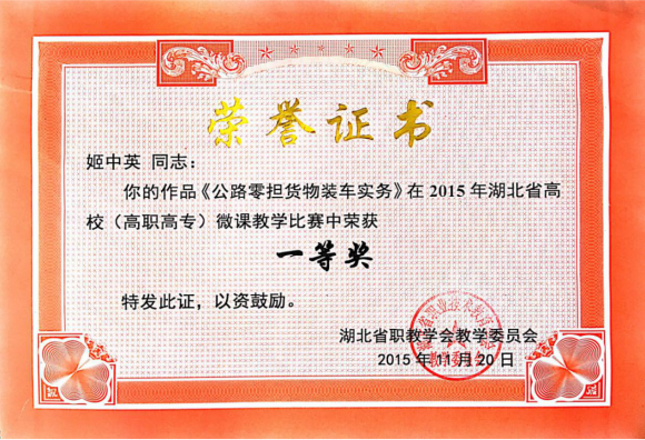 姬中英老师荣获2015年湖北省高校(高职高专)微课教学比赛一等奖