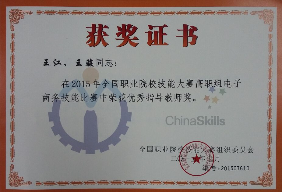 王江、王骏老师荣获2015年全国职业院校技能大赛电子商务技能赛项优秀指导教师奖