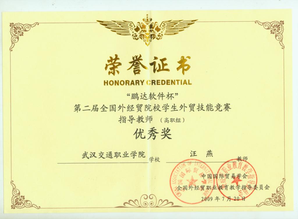 汪燕老师荣获2009年“鹏达软件杯”第二届全国外经贸院校学生技能竞赛指导教师优秀奖