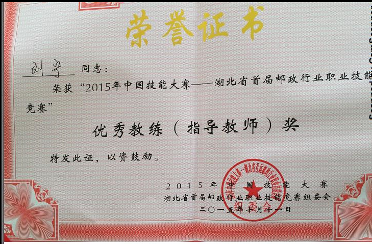 刘宁老师荣获2015年中国技能大赛---湖北省首届邮政行业技能竞赛“优秀指导教师奖”
