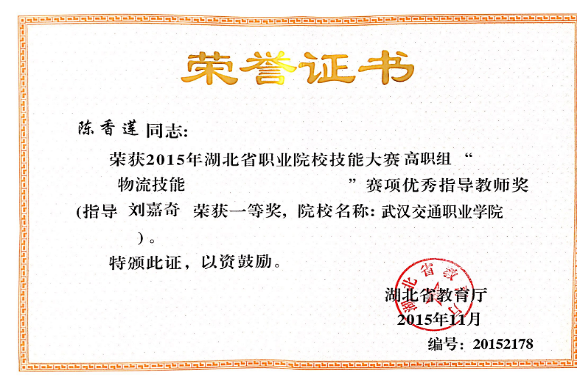 陈香莲老师荣获2015年湖北省职业院校技能大赛物流技能赛项“优秀指导教师奖”