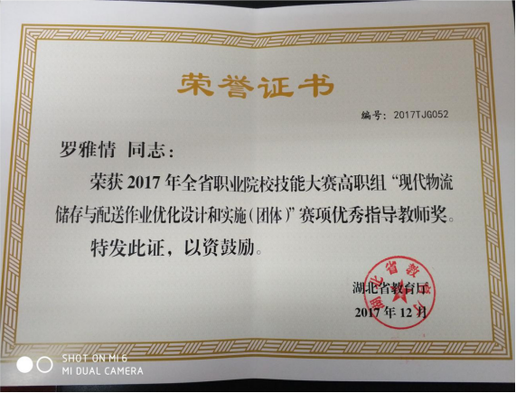 罗雅情老师荣获2017年湖北省职业院校技能大赛物流赛项“优秀指导教师”奖
