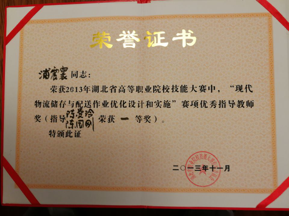 浦震寰2013年荣获湖北省职业院校技能大赛现代物流赛项获优秀指导教师奖